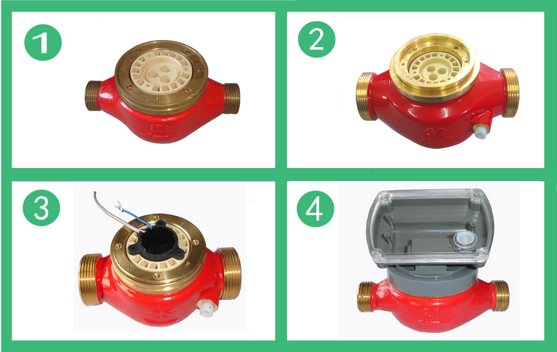 DS97TAR多流束無磁熱量表流量計的結(jié)構(gòu)如圖,其工作原理是:熱水進入流量計,經(jīng)進水導(dǎo)向孔沖擊計量腔內(nèi)的葉輪旋轉(zhuǎn),再經(jīng)出水導(dǎo)向孔流出流量計。葉輪上面嵌有不銹鋼膜片,隨葉輪旋轉(zhuǎn),在隔板上端接近不銹鋼膜片處可裝電感類傳感器,接受葉輪旋轉(zhuǎn)的周期信號。