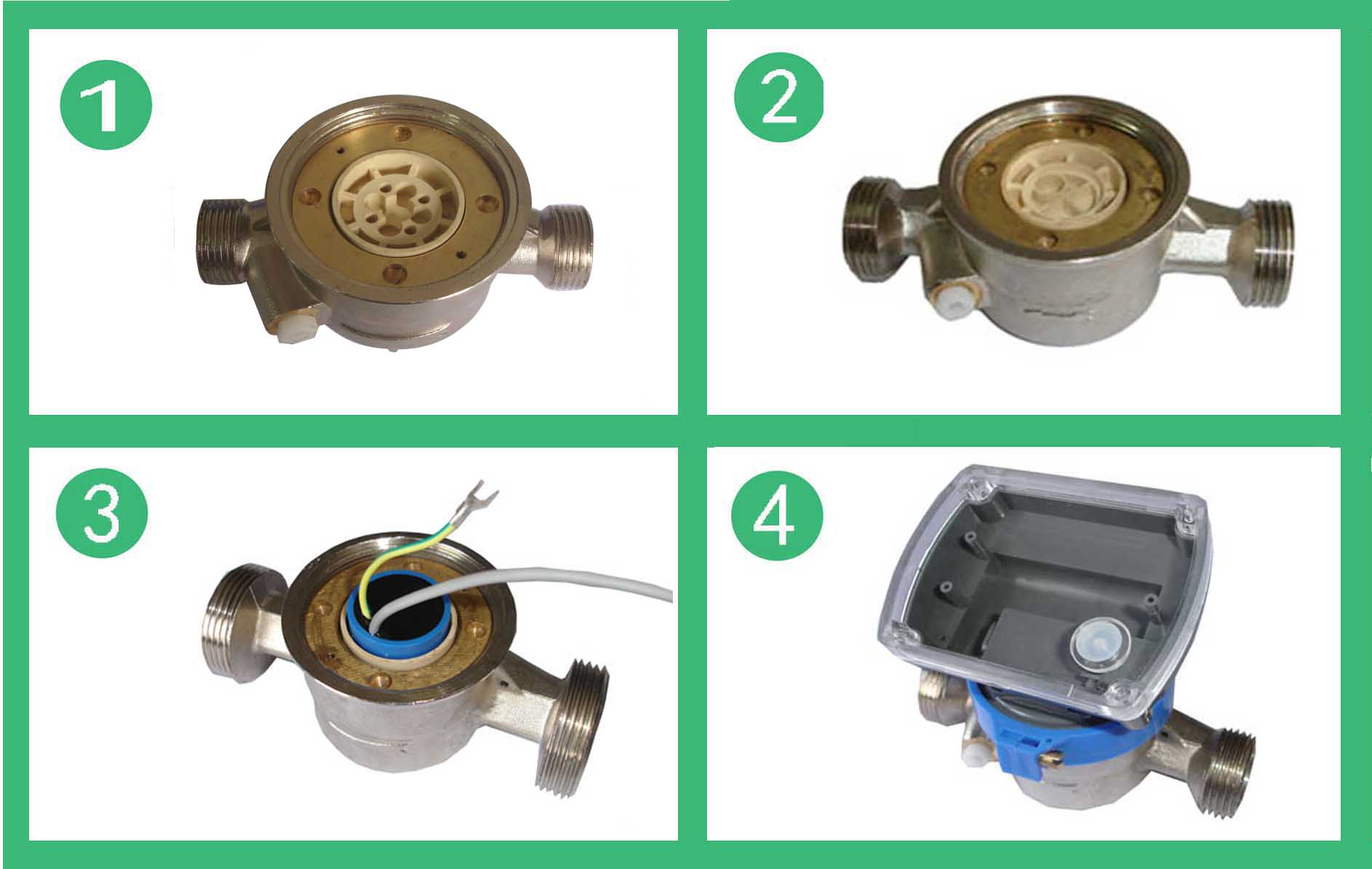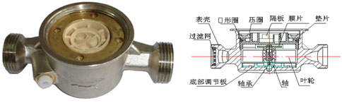 CD02TAR單流束無磁熱量表流量計(jì)的結(jié)構(gòu)如圖,其工作原理是:熱水進(jìn)入流量計(jì),經(jīng)進(jìn)水導(dǎo)向孔沖擊計(jì)量腔內(nèi)的葉輪旋轉(zhuǎn),再經(jīng)出水導(dǎo)向孔流出流量計(jì)。葉輪上面嵌有不銹鋼膜片,隨葉輪旋轉(zhuǎn),在隔板上端接近不銹鋼膜片處可裝電感類傳感器,接受葉輪旋轉(zhuǎn)的周期信號(hào)。